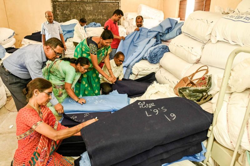 कलबुर्गी में स्कूल शिक्षा विभाग की ओर से सरकारी स्कूलों के छात्रों को नि:शुल्क वितरित किए जाने वाले यूनिफार्म को जोड़ते विभाग के कर्मचारी और शिक्षक।