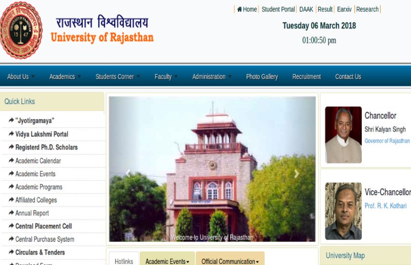 राजस्थान विश्वविद्यालय की स्नातकोत्तर परीक्षाएं 26 मार्च से शुरू होने वाली परीक्षा के लिए अधिकारिक वेबसाइट पर टाइम टेबल जारी कर दिया है। जल्द ही UNIRAJ PG Admit Card 2018 भी आधिकारिक वेबसाइट http://www.univraj.org/mainpageNew.php पर जारी कर दिए जाएंगे। प्रवेश पत्र प्रिंट लेने के लिए विद्यार्थी अपने नाम या आवेदन संख्या सबमिट कर सकते हैं।