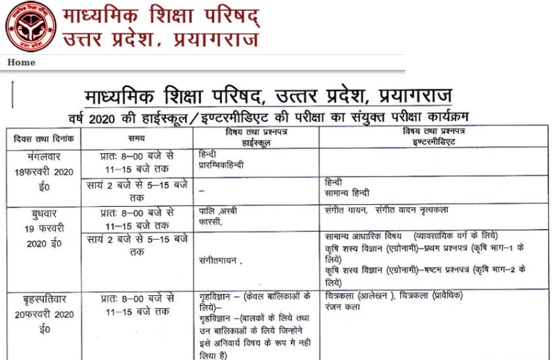 UP Board High school, Intermediate Date Sheet 2020