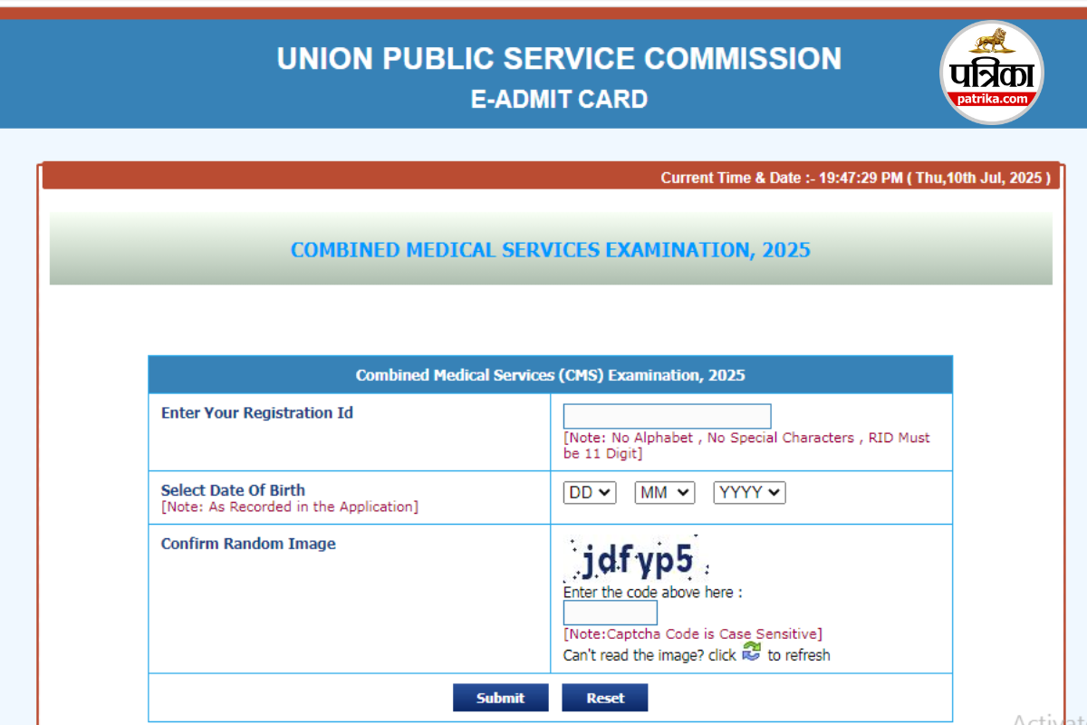 UPSC CMS Admit Card 2025 Download: यूनियन पब्लिक सर्विस कमीशन (UPSC) ने कंबाइंड मेडिकल सर्विस (CMS) परीक्षा 2025 के एडमिट कार्ड जारी कर दिए हैं। जिन उम्मीदवारों ने इस परीक्षा के लिए आवेदन किया था, वे अब ऑफिशियल वेबसाइट upsc.gov.in पर जाकर अपना एडमिट कार्ड डाउनलोड कर सकते हैं। यह परीक्षा भारत सरकार के विभिन्न मेडिकल विभागों में मेडिकल ऑफिसर जैसे पदों पर नियुक्ति के लिए आयोजित की जाती है।