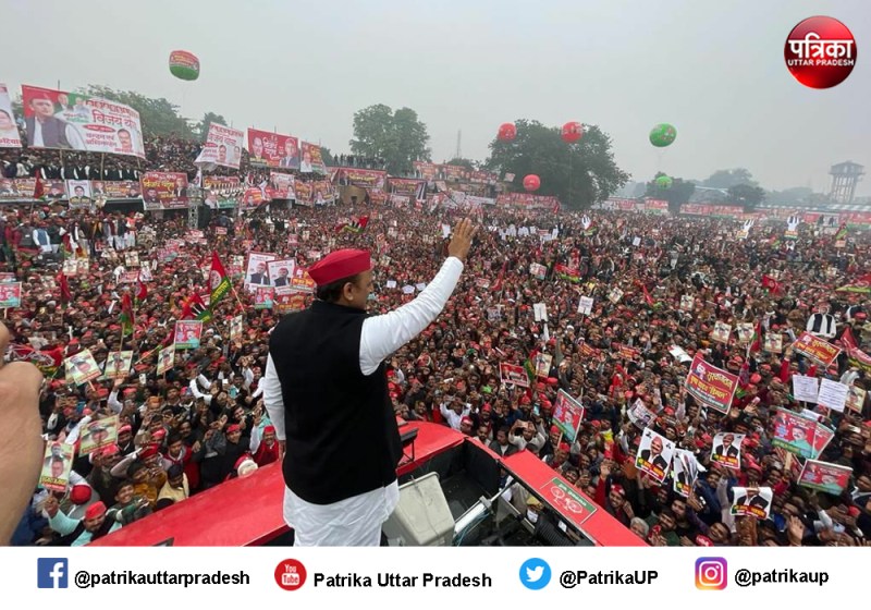 उन्नाव. UP Assembly Elections 2022 : समाजवादी पार्टी के अध्यक्ष अखिलेश यादव ने कहा कि उत्तर प्रदेश में उनकी सरकार बनने पर सांड से टकराने और साइकिल से चलने पर दुर्घटना में मौत होने पर पांच लाख का देंगे। उन्होंने कहा कि भारतीय जनता पार्टी का अयोध्या में राम मंदिर से कोई लेना-देना नहीं है। भाजपा वोट की राजनीति कर रही है। उन्होंने कहा कि सुप्रीम कोर्ट के फैसले के बाद श्रीराम मंदिर का निर्माण रोकने की हैसियत किसी में नहीं है। भाजपा भगवान श्रीराम के नाम पर सिर्फ वोट चाहती है, इसलिए दिल्ली से लखनऊ तक और लखनऊ से दिल्ली तक लगातार झूठ बोले जा रहे हैं। कानपुर में छापेमारी को लेकर सपा अध्यक्ष ने कहा कि केंद्र और प्रदेश में भाजपा की सरकार है सरकार बताए कि इतने बड़े पैमाने पर नोट कैसे पहुंचे।