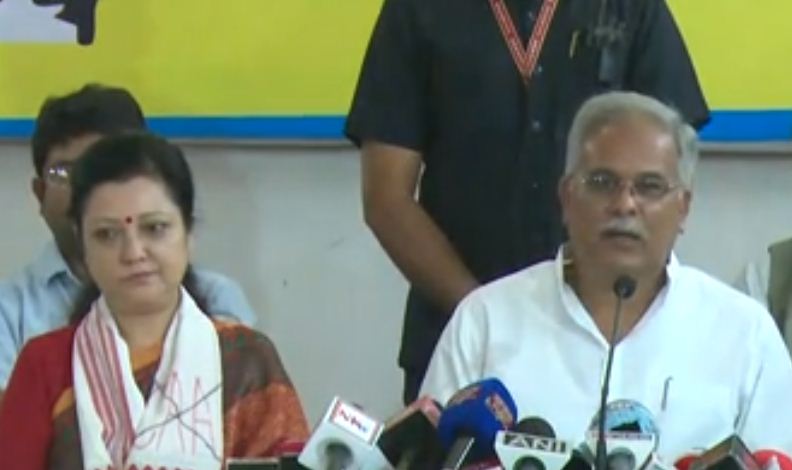 कांग्रेस नेता भूपेश बघेल प्रेसवार्ता को संबोधित करते हुए