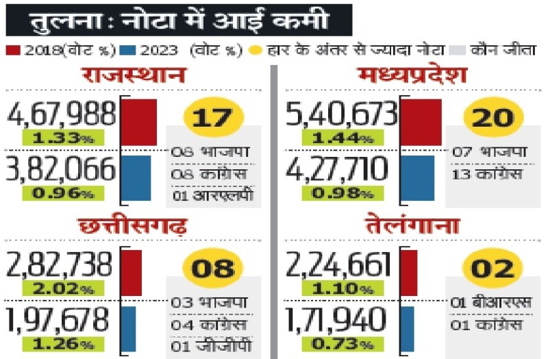 हालांकि, यह भी एक तथ्य है कि कुल मिलाकर, नोटा वोटों की हिस्सेदारी 2018 के चुनावों में 1.41% से घटकर इस बार 0.97 फीसदी हो गई। छत्तीसगढ़, मध्य प्रदेश, राजस्थान और तेलंगाना में केवल एक सीट पर नोटा का वोट शेयर पांच फीसदी से अधिक रहा। 2018 में नोटा वोटों का सबसे बड़ा हिस्सा छत्तीसगढ़ में था, जहां चार सीटों पर नोटा को 5 फीसदी से अधिक वोट मिले थे। राजस्थान में केवल एक सीट पर नोटा ने पांच फीसदी का आंकड़ा पार किया था।