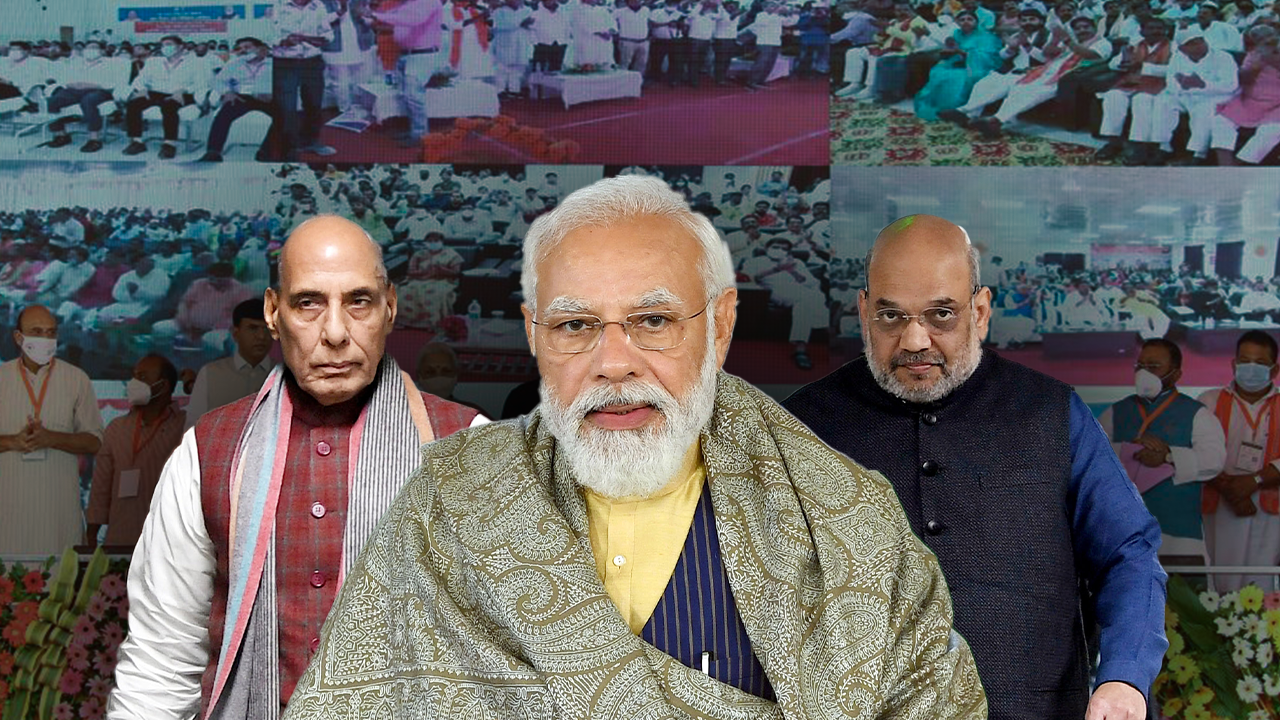 File Photo of PM Modi, Rajnath Nath Singh and Amit Shah During UP Elections Seventh Phase