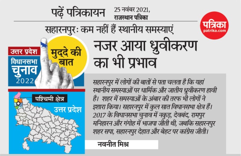 पश्चिमी उत्तर प्रदेश का प्रमुख शहर और जिला है सहारनपुर। यह उत्तराखंड और हरियाणा से सटे होने के साथ अपनी खास भौगोलिक स्थिति के कारण प्रमुख व्यापारिक केंद्र भी है। यहां की काष्ठ कला विश्व प्रसिद्ध है। सुंदर नक्काशी वाली लकडिय़ां विदेशों में, खासतौर पर अमरीका, लंदन, सिंगापुर जैसे देशों को सप्लाई होती हैं। विधानसभा चुनाव नजदीक आने पर सहारनपुर में भी सियासी पारा चढ़ा हुआ है। शहर से कस्बों और गांवों तक लोग राजनीतिक दलों और नेताओं का भविष्य अपनी-अपनी समझ और आंकड़ों से तय करते मिलते हैं। लोगों की बातों से पता चलता है कि यहां स्थानीय समस्याओं पर धार्मिक और जातीय ध्रुवीकरण हावी है। मेरठ, मुजफ्फरनगर की तरह सहारनपुर में भी कानून-व्यवस्था बेहतर होने की बात लोगों ने कही। लेकिन, शहर में समस्याओं के अंबार की तरफ भी लोगों ने इशारा किया।