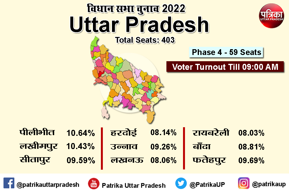 उत्तर प्रदेश विधानसभा 2022 चौथे चरण के लिए सुबह नौ बजे तक 9.10 फीसद वोटिंग हुई है। बुधवार को मतदान सुबह सात बजे से शुरू हो गया है। मतदान केंद्रों पर लंबी कतारें लगीं हुई हैं। यूपी के नौ जिलों लखनऊ, रायबरेली, लखीमपुर खीरी, सीतापुर, हरदोई, उन्नाव, फतेहपुर, पीलीभीत और बांदा के 59 विधानसभा क्षेत्रों में मतदान हो रहा है। विधानसभा चुनाव के चौथे चरण में 624 उम्मीदवार मैदान में हैं। नौ बजे तक पीलीभीत में सबसे अधिक 10.64 फीसद मतदान हुआ। वहीं अगर सबसे कम मतदान की बात करें तो सबसे हॉट रायबरेली में 8.03 फीसद हुआ।