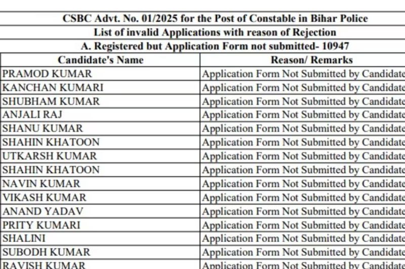CSBC Bihar Police Vacancy 2025: The Central Selection Council (Constable Recruitment) has released a list of candidates whose applications have been rejected for the Constable recruitment 2025. A total of 33,042 applications have been rejected. This recruitment is under advertisement number 01/2025, with a total of 19,838 positions to be filled.