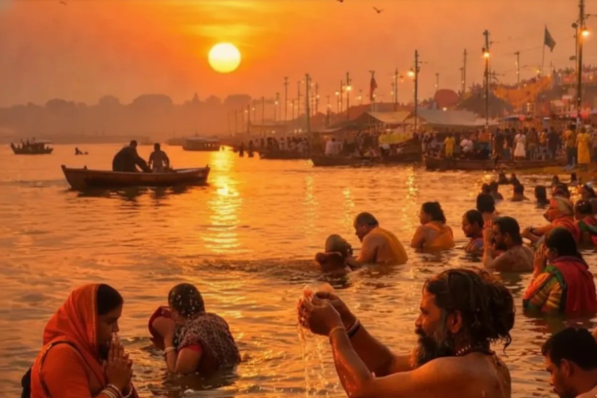 Taking a dip in the Sangam. It is believed that bathing here during the month of Magh washes away sins and brings peace to the mind. The fair is so large that the administration prepares a temporary tent city every time. Arrangements are made for ghats, hospitals, and security, so that devotees can perform their rituals without worry.