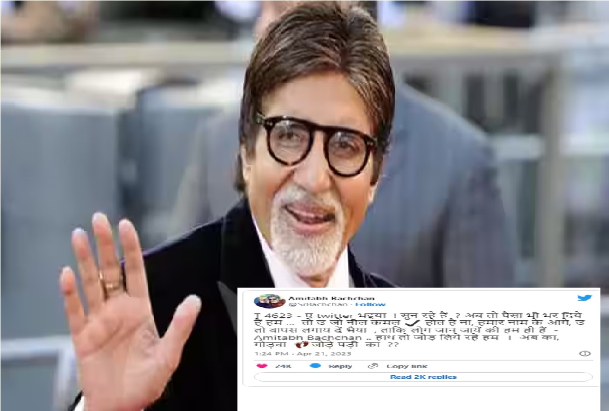 अमिताभ बच्चन ने लिखा कि वो ट्विटर ब्लू टिक के लिए पैसे भर चुके हैं। फिर भी उनके अकाउंट से ब्लू टिक गायब हो गया। उन्होंने हल्के-फुल्के अंदाज में कहा था कि हाथ तो जोड़ रहे हैं ब्लू टिक के लिए। तो क्या पैर भी जुड़वाएंगे क्या। अमिताभ बच्चन ने यह ट्विट इलाहाबादी में किया और अब उनका यह नया अंदाज लोगों को बहुत पसंद आ रहा है।