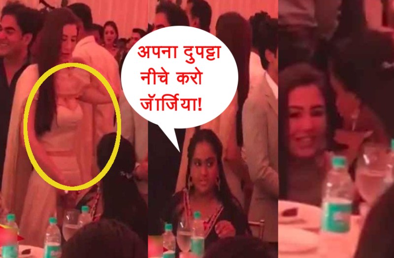 पार्टी में जॉर्जिया ऑफ व्हाइट कलर का लहंगा पहनकर पहुंची थीं और उन्होंने गले में दुपट्टा डाल रखा था। हाल में इफ्तार पार्टी का एक वीडियो सामने आया है। इस वीडियो में अर्पिता खान और जॉर्जिया एंड्रियानी आपस में बात करती नजर आ रही हैं। बातों ही बातों में अर्पिता, जॉर्जिया को पास बुलाती हैं और कहती हैं कि अपना दुपट्टा गले से नीचे कर लो।