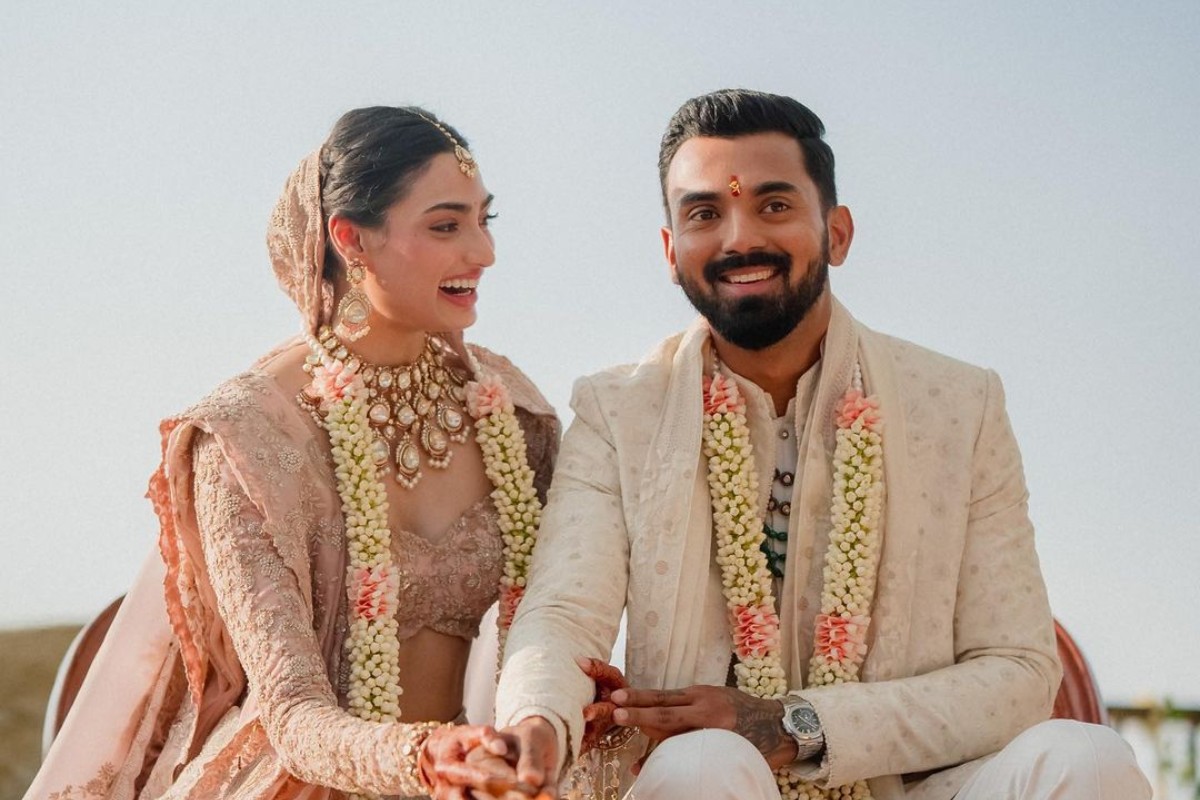 अथिया शेट्टी के एल राहुल की पहली तस्वीरें सामने आ चुकी हैं। इन फोटोज में के एल राहुल-अथिया शेट्टी ने पेस्टल पिंक आउटफिट कैरी किया हुआ है। आपको बता दें कि दोनों का यह खास आउटफिट सब्यासाची का है और इसकी डिजाइनर हैं अनामिका खन्ना। तो वहीं दूल्हा दुल्हन की पहली तस्वीरों से पहले सुनील शेट्टी और अहान शेट्टी का लुक सामने आ ही चुका है। सुनील शेट्टी ने पेस्टल पिंक कुर्ते के साथ धोती कैरी की तो वहीं अहान शेट्टी ने वाइट और गोल्डन कलर की कुर्ता शेरवानी पहनी। दोनों ने इस मौके पर पैपाराजी को मिठाई दी और हाथ जोड़कर सबका शुक्रिया अदा किया।