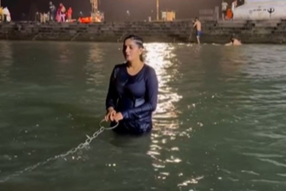 ब्लू कलर के सूट में सपना चौधरी ने मंत्र पढ़ते हुए नदी में डुबकी लगाई। 'ऊं नम: शिवाय' (Om namah Shivay) का जाप करते हुए सपना ने अपने फैंस के लिए भी प्रर्थना की। सपना चौधरी (Sapna Choudhary) का यह वीडियो सोशल मीडिया पर जमकर वायरल हो रहा है।