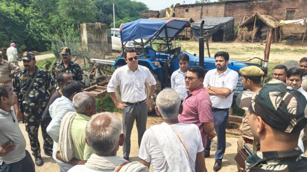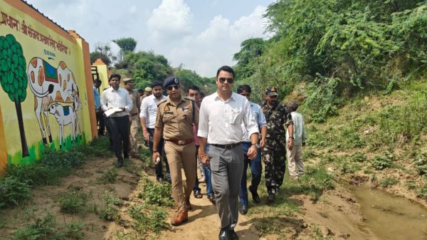 गांव की पगडंडियों में डीएम और एसएसपी संभावित बाढ़ प्रभावित क्षेत्र का निरीक्षण कर रहे हैं। साथ में प्रशासनिक अमला भी मौजूद है।