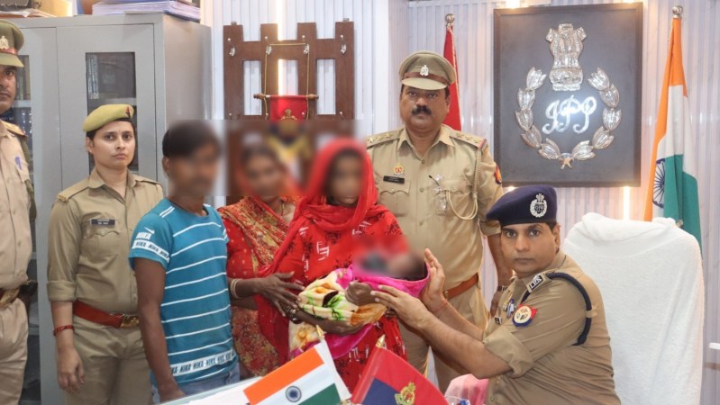 20 दिन के बच्चे को मां की गोद में देते एसएसपी इटावा