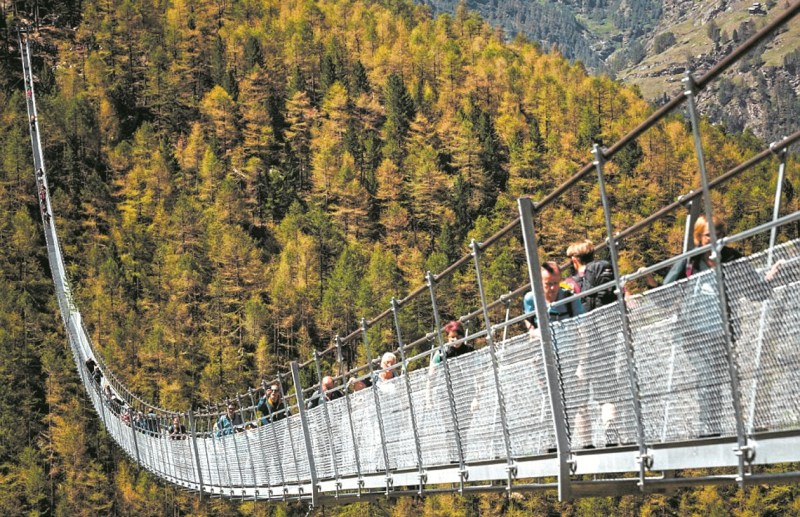 बर्न। स्विट्जरलैंड के जर्मेट में दुनिया का सबसे लंबा हैंगिंग ब्रिज आम लोगों के लिए खोल दिया गया है। इसे यूरोप ब्रिज के नाम से जाना जाता है। स्विट्जरलैंड के दो पहाड़ी गांवों जर्मेट और ग्रेशेन, रांडा को जोडऩे वाला यह पुल 1620 फीट लंबा और जमीन से 278 फीट ऊंचा है। ब्रिज से 278 फीट नीचे ग्राबेंग्युफर रेवाइन (खाई) है।