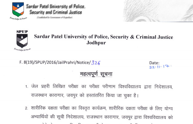 Rajasthan jail prahari result 2017 : जेल प्रहरी भर्ती 2015 का परीक्षा परिणाम विश्वविद्यालय द्वारा तैयार करके कारागार विभाग को भेजा जा चूका है। जल्द ही परिणाम जारी करके शारीरिक मापतौल के लिए एडमिट कार्ड दाल दिए जायेंगे। शारीरिक मापतौल के लिए प्रारूप तैयार करने में जुटा है कारागार विभाग। विभाग में तबादलों के चलते कारागार विभाग द्वारा परिणाम जारी करने में थोड़ा समय लगा। पुलिस महानिदेशक के सेवानिवृति के सभी विभागों में अधिकारीयों की बदली हुई है। इसी के चलते विभाग द्वारा परिणाम जारी करने में शारीरिक परीक्षा के लिए प्रबंधन की समस्या भी सामने आ रही थी।