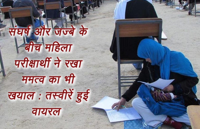 अफगान किसान Jahantab Ahmadi जमीन पर बैठी हैं। अपने सपनों को पूरा करने के लिए वह अपनी बच्ची को गोद में सुलाकर विश्वविद्यालय प्रवेश परीक्षा का पेपर हल कर रही है।