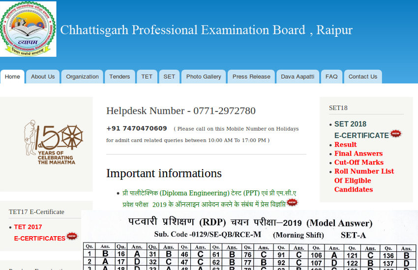 CG Vyapam Patwari Answer Key 2019 जारी कर दी गई है। पटवारी की भर्ती के लिए छत्तीसगढ़ व्यावसायिक परीक्षा मंडल (CGPEB) ने 17 मार्च, 2019 को लिखित परीक्षा आयोजित की थी। जिन अभ्यर्थियों ने परीक्षा उपस्थिति दर्ज करवाई थी, वे उत्तर कुंजी डाउनलोड कर सकते हैं। आपको बता दें कि पटवारी भर्ती परीक्षा सुबह 10:00 बजे से दोपहर 01:15 बजे तक आयोजित की गई थी।