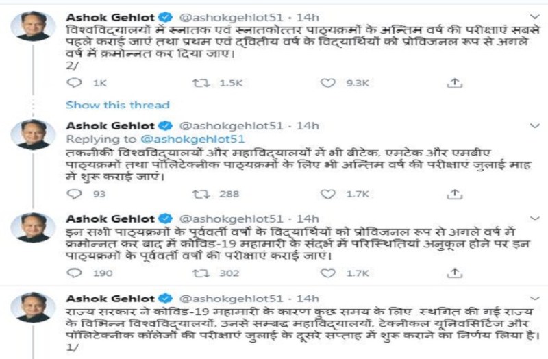 राजस्थान के मुख्यमंत्री अशोक गहलोत ने अधिकारियों को जुलाई में कोविद -19 लॉकडाउन के कारण स्थगित विश्वविद्यालयों की परीक्षाएं आयोजित करने का निर्देश दिया।