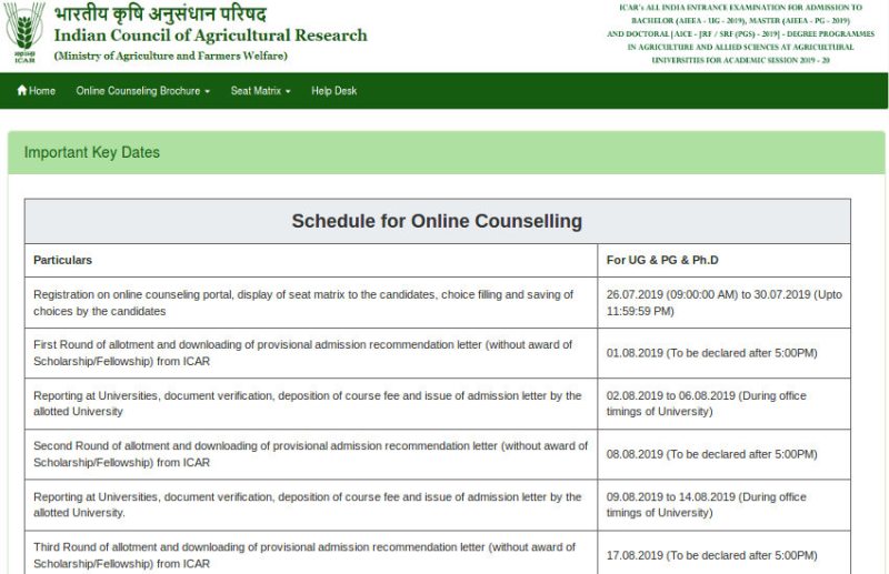 ICAR AIEEA Exam के लिए आधिकारिक वेबसाइट अभी व्यस्त है, इसलिए उम्मीदवारों को काउंसलिंग प्रक्रिया के लिए पंजीकरण करने से पहले कुछ समय इंतजार करना पड़ सकता है। ICAR 26 जुलाई से 30 जुलाई, 2019 तक पंजीकरण प्रक्रिया, सीट मैट्रिक्स का प्रदर्शन, विकल्प भरने और अंतिम प्रस्तुत करने का आयोजन करेगा। आवंटन के पहले दौर का परिणाम 1 अगस्त, 2019 को जारी किया जाएगा। आवंटन परिणाम जारी होने के बाद , उम्मीदवार अपने अनंतिम प्रवेश सिफारिश पत्र (छात्रवृत्ति / फैलोशिप के पुरस्कार के बिना) भी डाउनलोड करने में सक्षम होंगे।