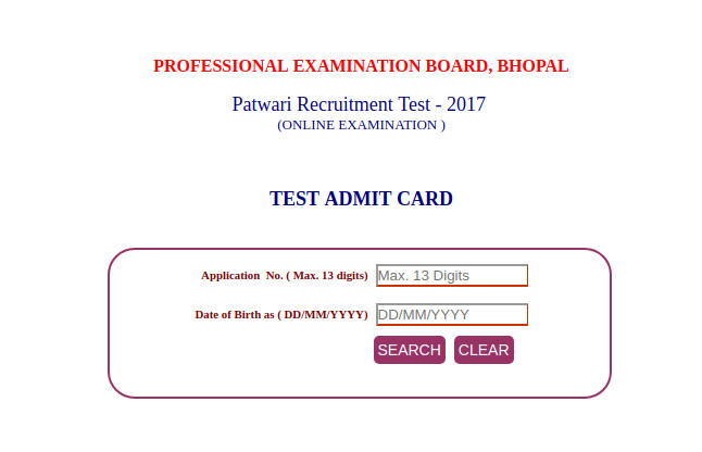 राज्य में बड़े पैमाने पर 9,235 पटवारी के पदों पर भर्ती के लिए परीक्षा का आयोजन होगा। परीक्षा हेतु उम्मीदवार अपने प्रवेश पत्र डाउनलोड करने के लिए मध्य प्रदेश पेशेवर परीक्षा बोर्ड (व्यापम) की वेबसाइट पर जाकर डाउनलोड कर सकते हैं। www.vyapam.nic.in पर लॉग इन करके ही डाउनलोड करना पड़ेगा। परीक्षा-केंद्र पर बिना प्रवेश पत्र के उम्मीदवारों को प्रवेश नहीं दिया जायेगा साथ ही पहचान-पत्र भी अनिवार्य रूप से लाना होगा। पटवारी भर्ती के लिए लिखित परीक्षा 9 दिसंबर से 31 दिसंबर 2017 के बीच होनी हैं। परीक्षा दो पारियों आयोजित होंगी।प्रथम पारी सुबह 9 बजे शुरू होगी। सुबह की परीक्षा के लिए परीक्षार्थियों को परीक्षा केंद्र पर सुबह 7:30 बजे रिपोर्ट करना होगा।द्वितीय पारी की परीक्षा दोपहर 3 बजे से शुरू होगी और जिसके लिए रिपोर्टिंग टाइम दोपहर 1.30 बजे है।