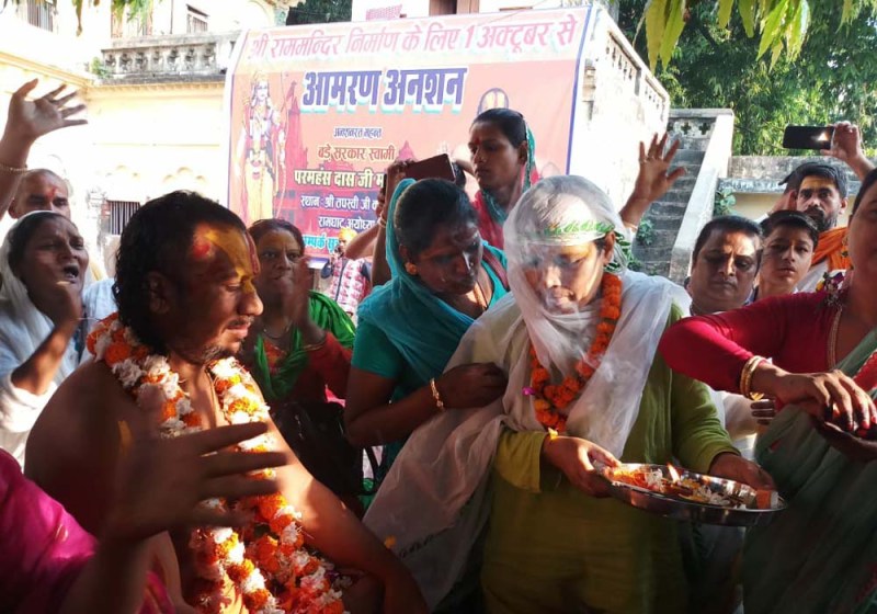 अनशन पर बैठे महंत परमहंस दास ने कहा कि देश के प्रधानमंत्री अयोध्या कर रामलला का दर्शन नहीं करेंगे तो अब हम अपना प्राण त्याग करने के लिए तैयार हैं आज हमें देश के सभी वर्गों के साथ सभी संत व प्रवीण तोगड़िया और शिवसेना का भी समर्थन मिल चुका है इसके साथ ही आज देश के किन्नर समाज के लोग भी हमारे समर्थन में आए हुए हैं ,आज मोदी पूरी दुनिया में पहुंच रहे हैं एक बार अयोध्या में भी राम लला का दर्शन करने पहुंचे और लोगों को एक पुख्ता आश्वासन दे कि कब तक रामलला का मंदिर निर्माण हो सकेगा 100 करोड़ जनता राम मंदिर की आस में है इसी आश में अभी तक हमारी कई पीढ़ियां मर चुकी हैं आखिर कब तक लो मरते रहेंगे मोदी अयोध्या आये यही हमारी मांग है।