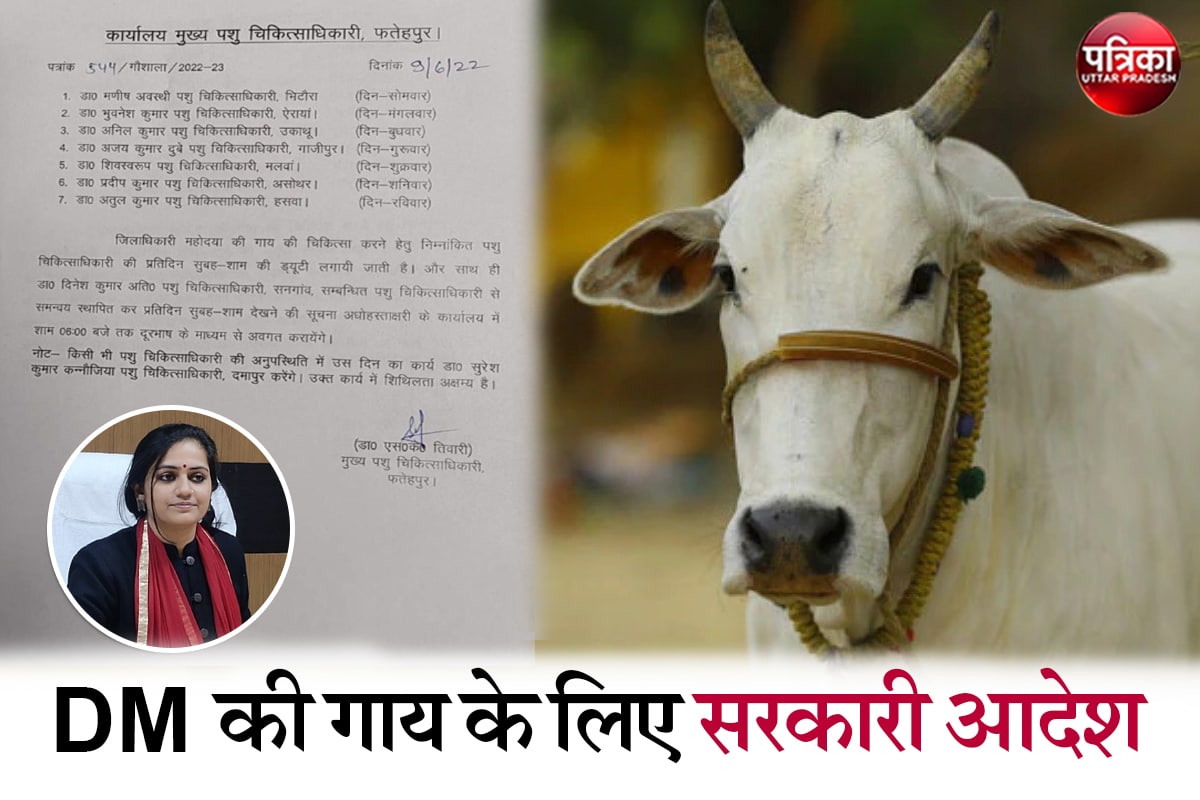 दरअसल, ये मामला फतेहपुर का है। यहां तैनात डीएम अपूर्वा दुबे की गाय के लिए सात सरकारी ड़ॉक्टरों की फौज तैयार की हुई है। डीएम अपूर्वा दुबे लंबे समय से फतेहपुर में तैनात हैं। जानकारी के अनुसार पता चला कि इनकी गाय को कुछ समस्या हुई तो हर दिन अलग अलग डॉक्टरों की ड्यूटी लगा दी गई। इसके लिए बाकयदा शासनादेश जारी हुआ। ऐसे में लोगों ने न केवल वीआईपी ड्यटी बल्कि आम लोगों की समस्याओं को नजरंदाज करने पर भी सवाल उठाए। इसमें ड़ॉ मणीष अवस्थी, डॉ भुवनेश कुमार, डॉ अनिल कुमार, डॉ अजय कुमार दुबे, डॉ शिवस्वरूप, डॉ प्रदीप कुमार, डॉ अतुल कुमार और इनकी गैर हाजिरी पर डॉ सुरेश कुमार कनौजिया की ड्यूटी लगाई गई।