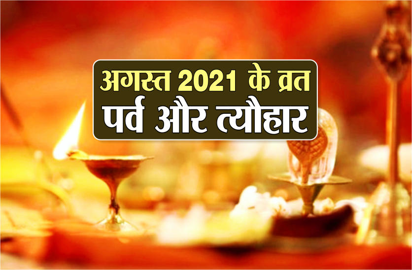 अगस्त 2021 के व्रत, त्यौहार व पर्व की लिस्ट : पंडित सुनील शर्मा के अनुसार अगस्त 2021 में सबसे पहले कामिका एकादशी पड़ेगी, इसके बाद प्रदोष व्रत, श्रावण अमावस्या,हरतालिका तीज, नाग पंचमी,स्कन्द षष्ठी,सिंह संक्रांति, रक्षा बन्धन,कजरी तीज व कृष्ण जन्माष्टमी सहित करीब डेढ़ दर्जन त्यौहार आएंगे।