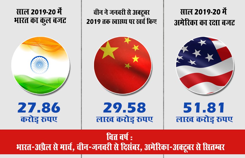 भारत के मुकाबले अमेरिका अपने रक्षा बजट पर 17 गुना और चीन 4 गुना खर्च करता है। भारत का रक्षा बजट 2019-20 में 3 लाख 5 हजार 296 करोड़ रुपए था। पिछले बजट में सरकार ने स्वास्थ्य के लिए 64 हजार 999 करोड़ रुपए खर्च किए थे। वहीं अमेरिका का हेल्थ बजट 88.66 लाख करोड़ रुपए (1,248.8 अरब डॉलर) है। जबकि चीन ने अक्टूबर 2019 तक ही कुल 10 महीने में स्वास्थ्य पर 1.46 लाख करोड़ रुपए खर्च कर दिए।