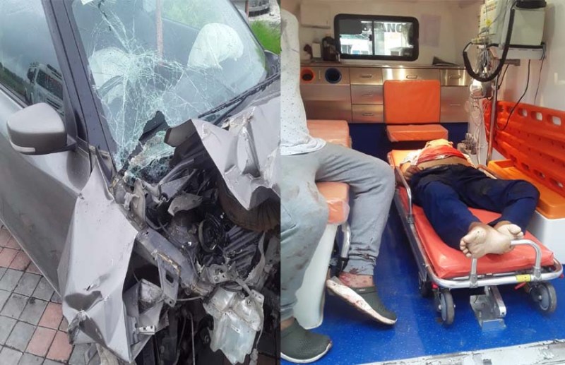 हादसे में क्षतिग्रस्त हुई कार और एंबुलेंस में घायल बेटा