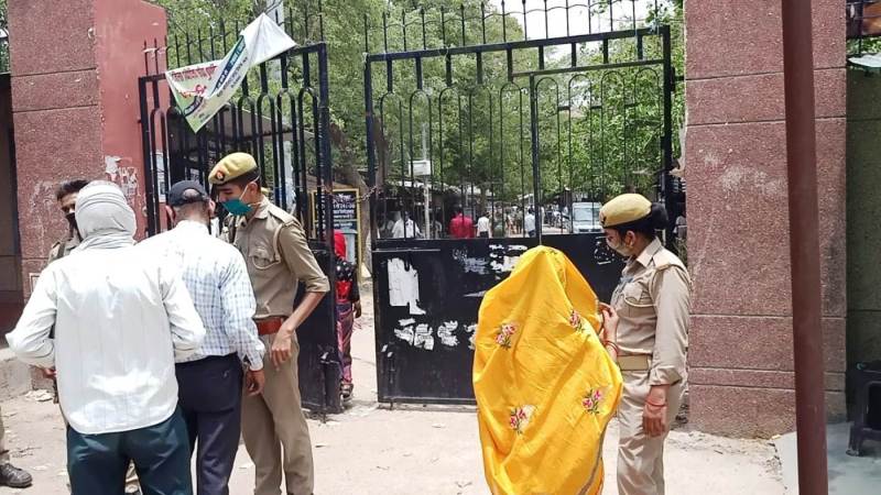 कोर्ट के बाहर चेकिंग करती पुलिस