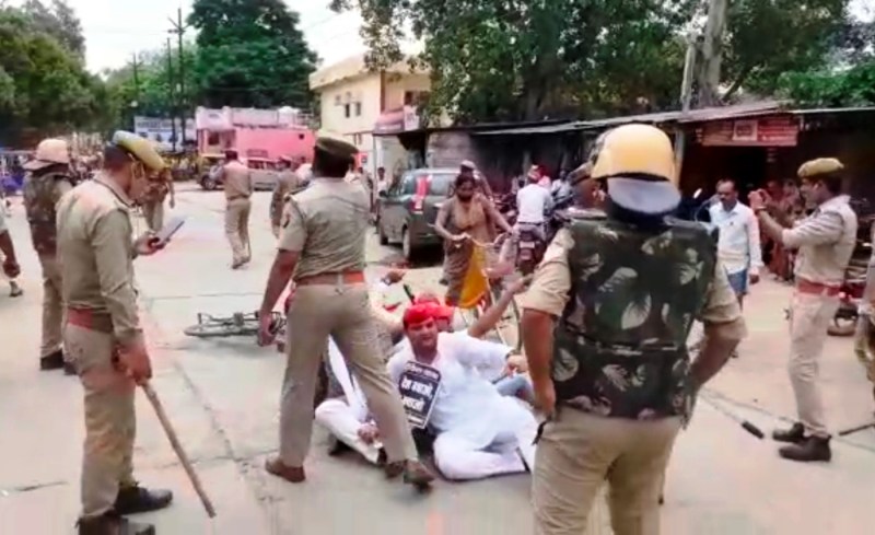 सड़क पर बैठे सपाइयों को उठाती पुलिस