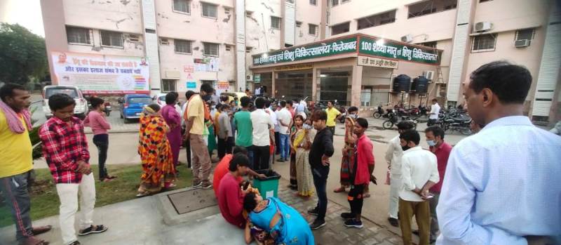 मेडिकल कॉलेज के बाहर बैठे बीमार बच्चों के परिजन