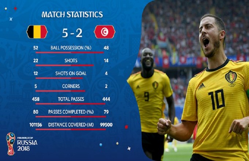 बेल्जियम के लिए इस मैच में हेजार्ड और लुकाकु के अलावा, मिती बात्शुयाई (90वें मिनट) ने भी गोल किया, वहीं ट्यूनीशिया के लिए दो गोल डेलन ब्रोन (18वें मिनट) और कप्तान वाहबी खाजरी (93वें मिनट) ने किए।