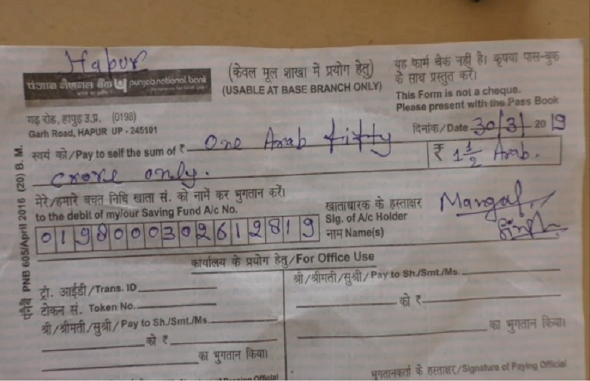 हापुड़. यूपी के जिला हापुड़ में पीएनबी बैंक में उस समय हड़कंप मच गया, जब एक युवक बैंक में डेढ़ अरब रूपये निकालने के लिए पहुंच गया। युवक ने बैंक में डेढ़ अरब की सिलिप भरके बैंक केशियर के हाथ में थमा दिया। डेढ़ अरब रूपये निकालने की सिलिप देखकर बैंक केशियर के होश उड़ गए। आनन-फानन में वह अपनी कुर्सी छोड़कर अपने बैंक मैनेजर के पास पहुंच गया। कैशियर ने जब पूरे मामले की जानकारी मैनेजर को दी बड़े घाटाले के बाद इस सूचना पर उनके भी होश उड़ गए। जब बैंक कर्मचारियों को पता चला कि मंगल सिंह नाम का एक युवक डेढ़ अरब रूपये निकालने आया है तो बैंक कर्चारी भी अपनी-अपनी कुर्सी छोड़कर उसको देखने लगे बाद में बैंक कर्चारियों ने पुलिस को मामले की सुचना दी। सुचना मिलते सिटी कोतवाली पुलिस भी मौके पर पहुंच गयी। युवक को हिरासत में लेकर सिटी कोतवाली ले आई। यहां पुलिस उससे पूछताछ कर रही है। पुलिस ने बताया कि युवक दिमागी रूप से कमजोर है, जिस कारण वह बैंक में डेढ़ अरब रूपये निकालने गया था।