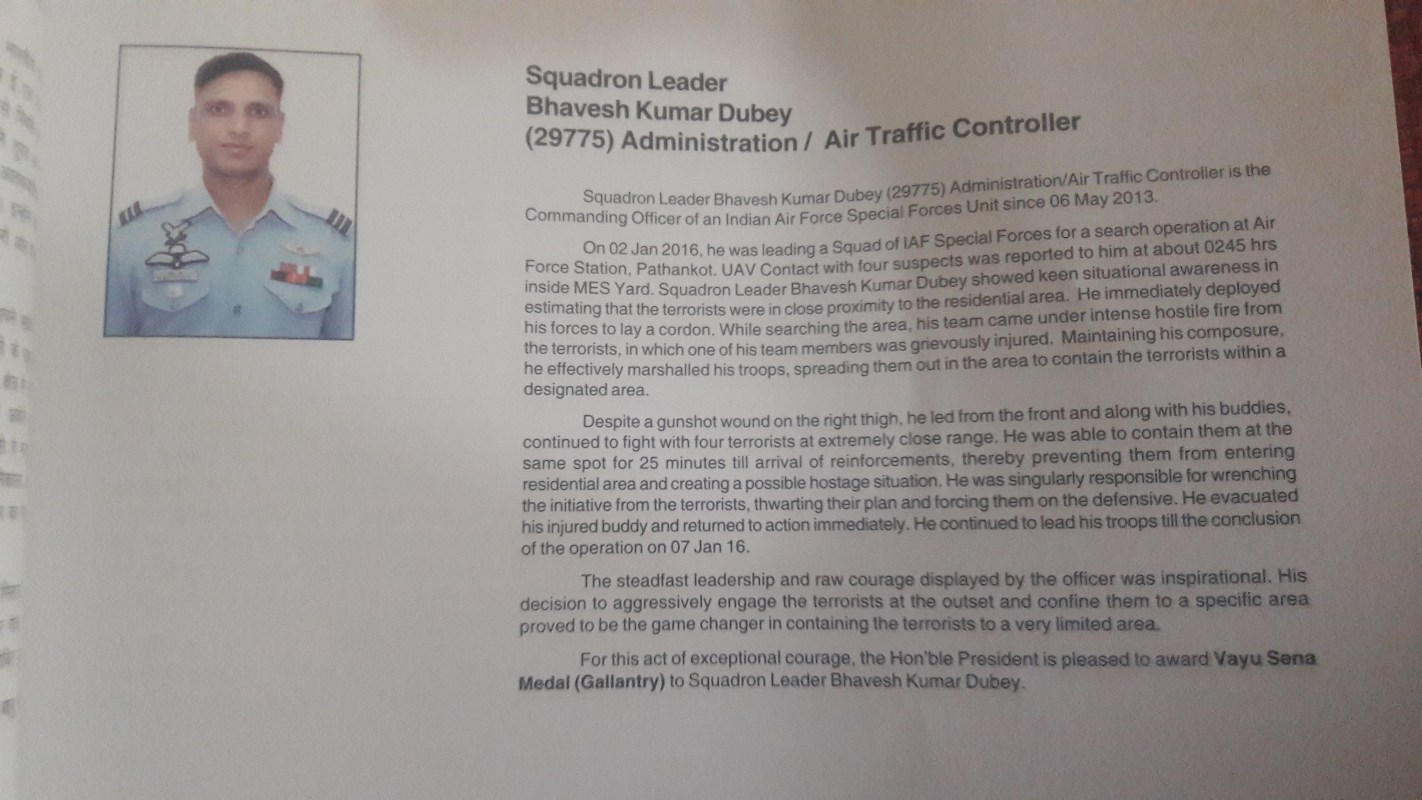 स्कवाडन लीडर भावेश कुमार दूबे 2 जनवरी 2016 को पठानकोट वायु स्टेशन पर तैनात थे। यहां आंतकी हमला होने पर घेराबंदी करके उन्हें रोका लिया गया। आतंकी हमले में उनके पैर में गोली लग गई और उनका एक साथी भी घायल हो गया। इसके बावजूद उन्होंने आंतकियों को पच्चीस मिनट तक रोके रखा। जवानों की हिम्मत की वजह से आंतकियों के हौसले टूट गए और वो अपने बचाव में लग गए। घायल होने के बावजूद सात जनवरी तक उन्होंने टीम का नेतृत्व किया था।