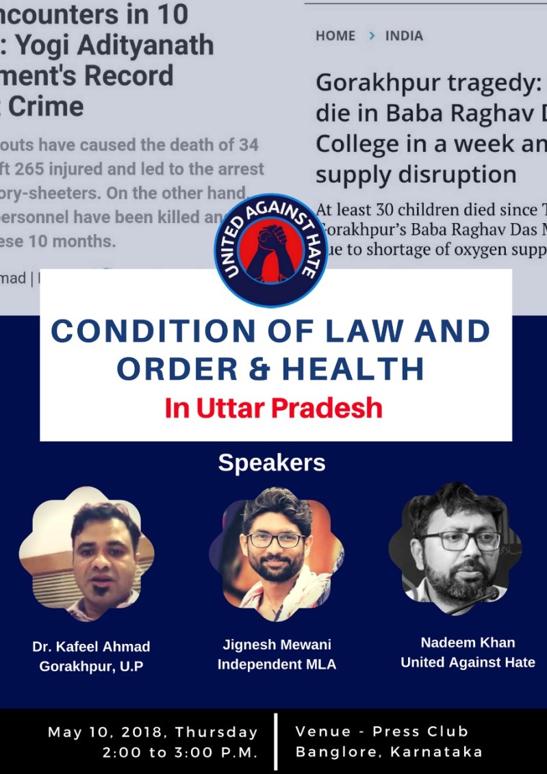 आज गुरुवार को जब पीएम मोदी समेत भाजपाई दिग्गज देश को विकास की पटरी पर सरपट दौड़ाने का दावा कर रहे होंगे तो यूपी और गुजरात के कई चेहरे बंगलुरू में यूपी के बारे में बयां कर रहे होंगे। इस कार्यक्रम में बीआरडी आक्सीजन कांड में आरोपी बनाकर आठ महीने तक जेल में रहकर बाहर आने वाले डाॅ.कफिल खान भी होंगे। तो गुजरात से निर्दलीय ही विधायक बनने वाले जिग्नेश मेवाणी होंगे।