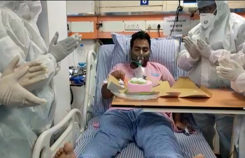 गाजियाबाद के एक निजी अस्पताल के आईसीयू वार्ड में भर्ती मरीजों का हौसला बढ़ाने के लिए सेलिब्रेट किया कोरोना संक्रमित युवक बर्थ-डे।