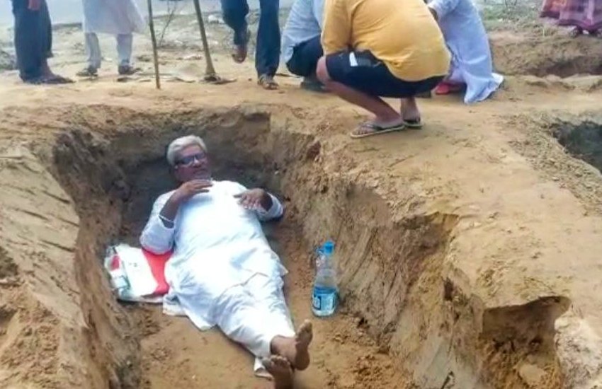 गाजियाबाद. उत्तर प्रदेश गाजियाबाद जिले के लोनी इलाके में आवास विकास द्वारा अधिग्रहण की गई जमीन का बढ़ा हुआ मुआवजा की मांग को लेकर पिछले 5 साल से किसान प्रदर्शन कर रहे हैं। किसानों ने जिंदा समाधि लेने की चेतावनी दी थी, इसके लिए बाकायदा मुख्यमंत्री और प्रधानमंत्री को भी पत्र द्वारा अवगत कराया गया था। लेकिन कोई सुनवाई नहीं होने पर बुधवार सुबह ही किसानों ने समाधि लेने के लिए बनाए गए गड्ढों में खुद लेट गए। हालांकि मौजूद पुलिसकर्मियों ने उनके ऊपर मिट्टी नहीं डालने दी।