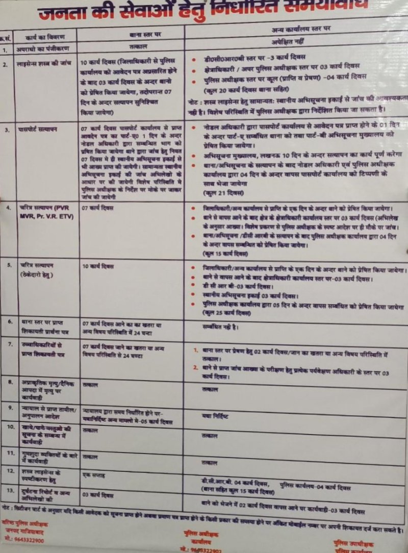 गाजियाबाद। पुलिस कार्यप्रणाली को और प्रभावी व पारदर्शी बनाने के लिए एसएसपी कलानिधि नैथानी (SSP Kalanidhi Naithani) कई कदम उठा रहे हैं। इस कड़ी में अब उन्होंने सिटीजन चार्टर (Citizen Charter) को प्रभावी बनाने के निर्देश दिए हैं। पुलिस (Police) से जुड़ी हुई सेवाएं लोगों को निर्धारित समय में दी जाएंगी। ऐसा नहीं होने पर संबंधित अधिकारी या कर्मी पर कार्रवाई की जाएगी। इसके तहत एसएसपी ने अपने ऑफिस के बाहर सिटीजन चार्टर का बोर्ड भी लगवाया है। इसमें लोगों की मिलने वाली सेवाओं और उसके तय समय के बारे में लिखा हुआ है। इस बारे में गाजियाबाद (Ghaziabad) पुलिस ने ट्विटर (Twitter) अकाउंट पर जानकारी दी है।