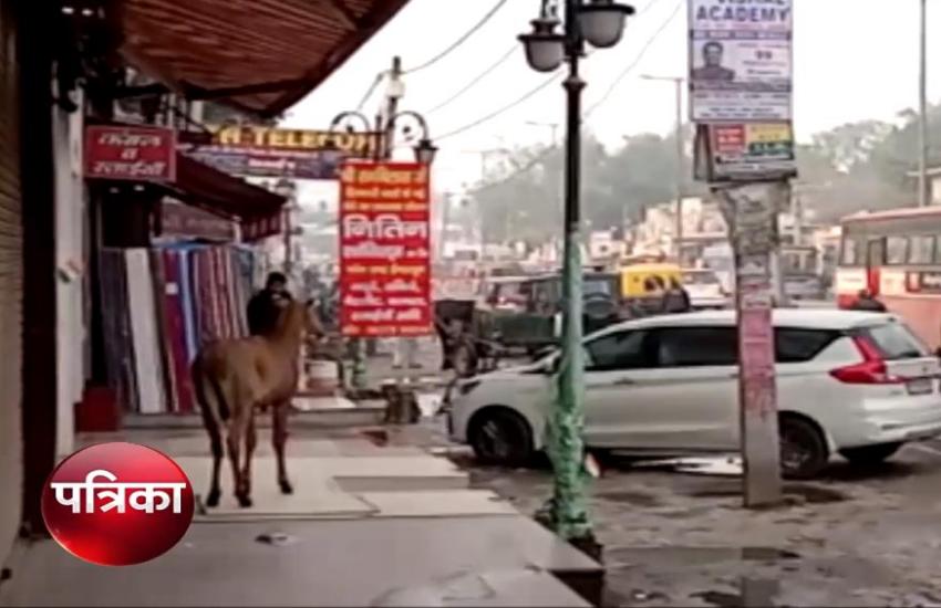 गाजियाबाद। जनपद के मोदीनगर के मेन बाजार में उस वक्त अफरा-तफरी का माहौल हो गया, जब लोगों ने घायल अवस्था में एक नील गाय को दौड़ते हुए देखा। बताया जा रहा है कि पिछले 5 घंटे से नीलगाय बाजार में इधर-उधर दौड़ती। जिसकी सूचना स्थानीय पुलिस को भी दी गई। सूचना के आधार पर मौके पर पहुंची स्थानीय पुलिस द्वारा वन विभाग को सूचित किया गया।