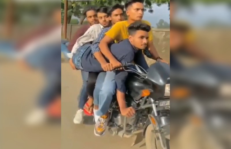 गाजियाबाद के एसपी ट्रैफिक रामानंद कुशवाहा ने बताया कि सोशल मीडिया पर एक वीडियो वायरल हो रहा है, जिसमें बड़ा रिस्क लेते हुए एक बाइक पर पांच युवक स्टंटबाजी करते हुए नजर आ रहे हैं। वायरल हो रहे 14 सेकंड के वीडियो में चार युवक बाइक पर बैठे हैं। जबकि उन्होंने एक युवक को सामान की तरह हाथों से पकड़ रखा है। इस वीडियो का संज्ञान लिया गया तो बाइक का नंबर गाजियाबाद जिले का ही पाया गया। नंबर के आधार पर जांच की गई तो यह बाइक थाना विजय नगर इलाके के सेक्टर-12 में रहने वाले सुनील बसौर के नाम पाई गई। उन्होंने बताया कि चार अलग-अलग यातायात नियमों के उल्लंघन में सुनील बसौर के नाम 12000 के जुर्माने के साथ ऑनलाइन चालान कर दिया गया है।