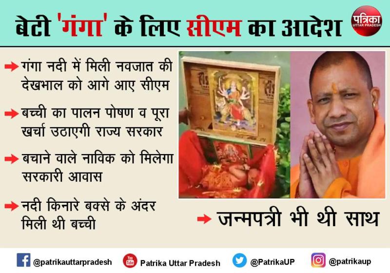 मुख्यमंत्री ने मामले का संज्ञान लेते हुए अधिकारियों को निर्देश दिए कि बच्ची गंगा का पालन चिल्ड्रेन होम में सरकारी खर्चे पर किया जाए। उन्होंने डीएम समेत संबंधित विभाग को पूरी सहायता करने के निर्देश दिए हैं। इसके साथ ही बच्ची को बचाने वाले नाविक को तत्काल सरकारी आवास समेत सभी सरकारी सहायता देने के भी निर्देश दिए हैं।
