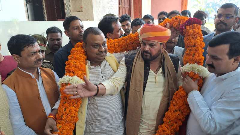 माला पहनाकर स्वागत करते स्थानीय लोग