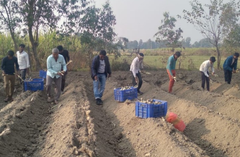 गन्ने के साथ आलू की बुवाई करते किसान अनिल पांडे