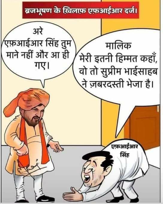 BJP सांसद बृजभूषण शरण सिंह के खिलाफ FIR दर्ज होने के बाद फेसबुक पर तमाम तरह के पोस्टर वायरल हो रहा है। उसमें से एक पोस्ट काफी जम कर वायरल हुआ जिसको लेकर लोगों ने खूब कमेंट किया। किसी ने लिखा कि कार्टून सुंदर है तो वहीँ किसी ने लिखा सरकार उनकी है कुछ नहीं होगा। दरअसल, इस पोस्टर में बृजभूषण सिंह के आगे एक आदमी कार्टून के तौर पर झुका है जिसके FIR बताया गया है। और उसमें लिखा है कि मेरी इतनी हिम्मत नहीं है। मुझे सुप्रीम कोर्ट भाईसाहब ने भेजा है।