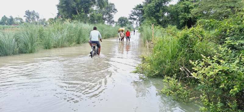 नवाबगंज में गांव जाने वाले मार्ग पर बाढ़ का पानी