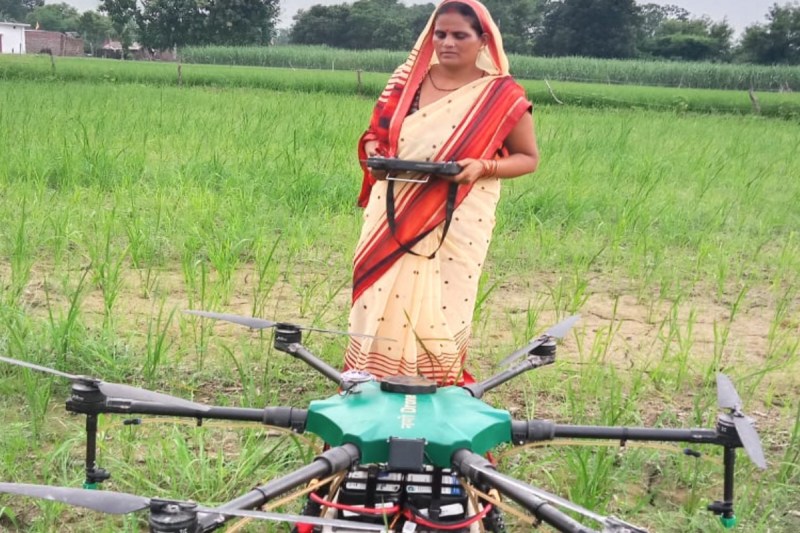 शिक्षक लेने के बाद खेत में ड्रोन से छिड़काव करती महिला