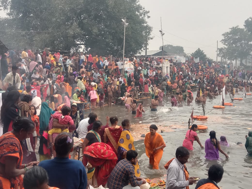 पवित्र सरयू नदी में कार्तिक पूर्णिमा पर स्नान करते श्रद्धालु