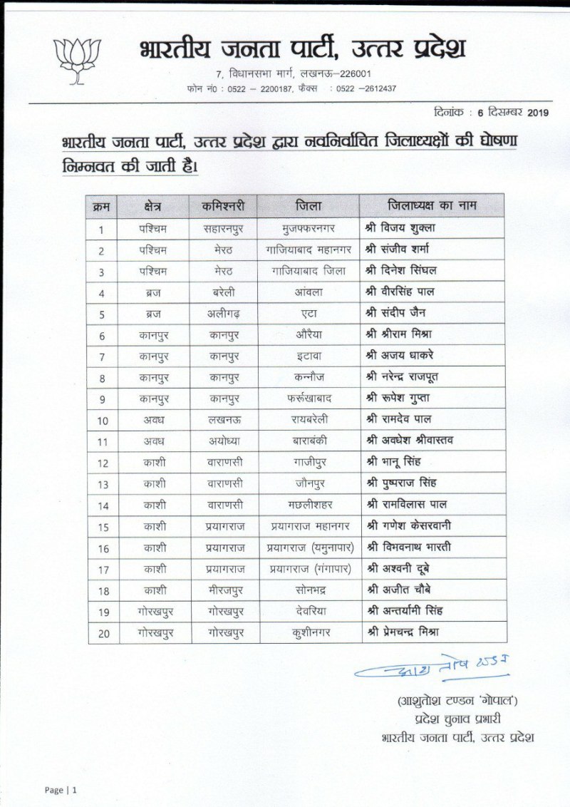 शुक्रवार की देर रात में यूपी भाजपा के प्रदेश चुनाव प्रभारी आशुतोष टंडन ने जिलाध्यक्षों के मनोनयन की दूसरी सूची जारी की। इस सूची में बीस जिलों के जिलाध्यक्षों के नामों की घोषणा की गई।
